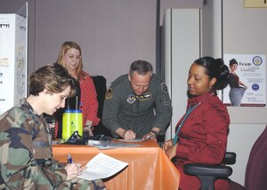 Air Force Materiel Command's top two leaders sign up for Team Lean Challenge, a command-wide competition to promote wellness and weight loss through camaraderie and enjoyable activity. Gen. Bruce Carlson, center, commander of Air Force Materiel Command, and Lt. Gen. Terry Gabreski, left, AFMC vice
