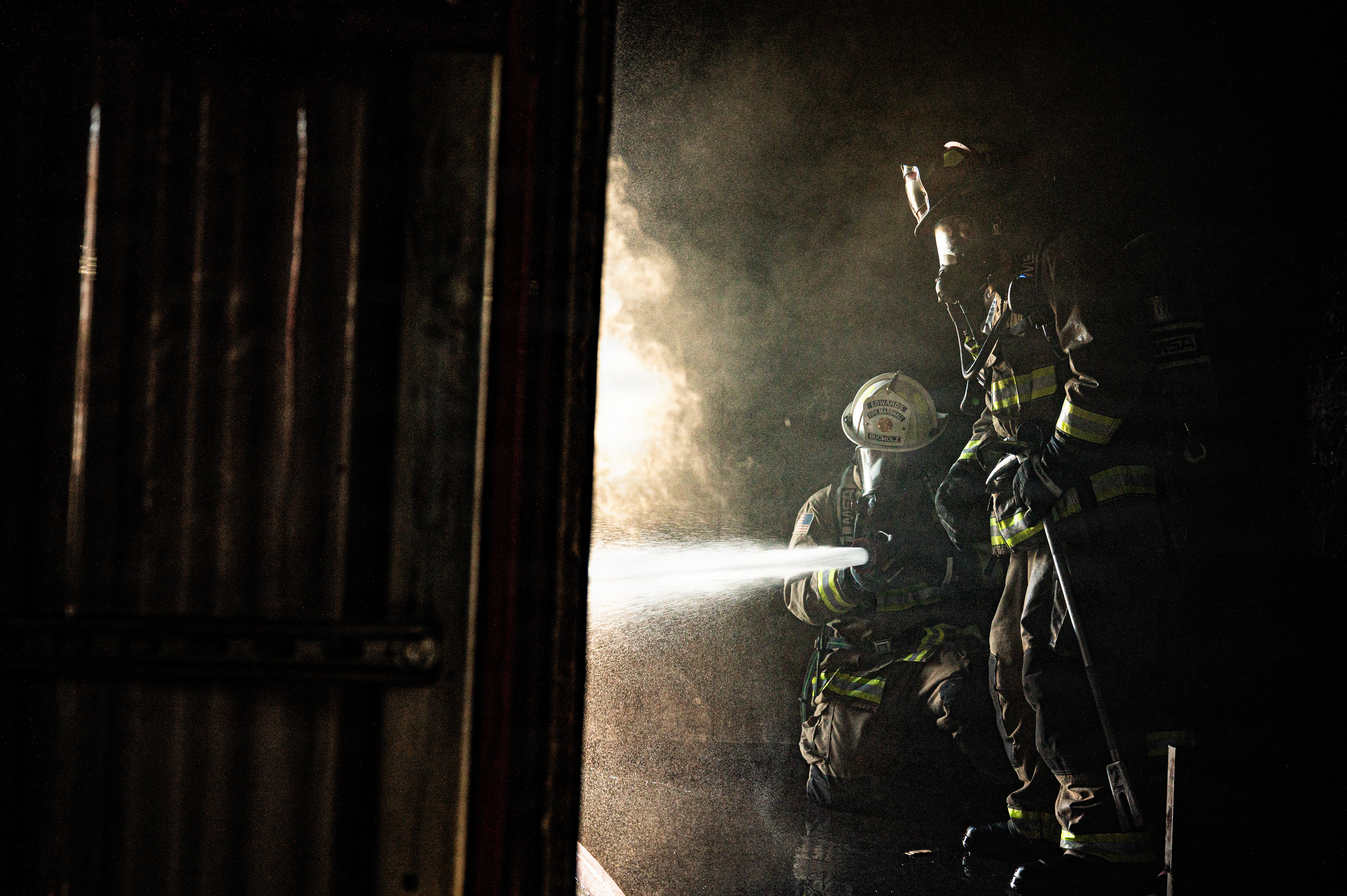 Col. Thomas Tauer, 412th Test Wing commander, and members of the 812th Civil Engineer Squadron conduct structural fire training at Edwards AFB Oct. 22. (Photo by Master Sgt. Tabatha Arellano, AFTC)