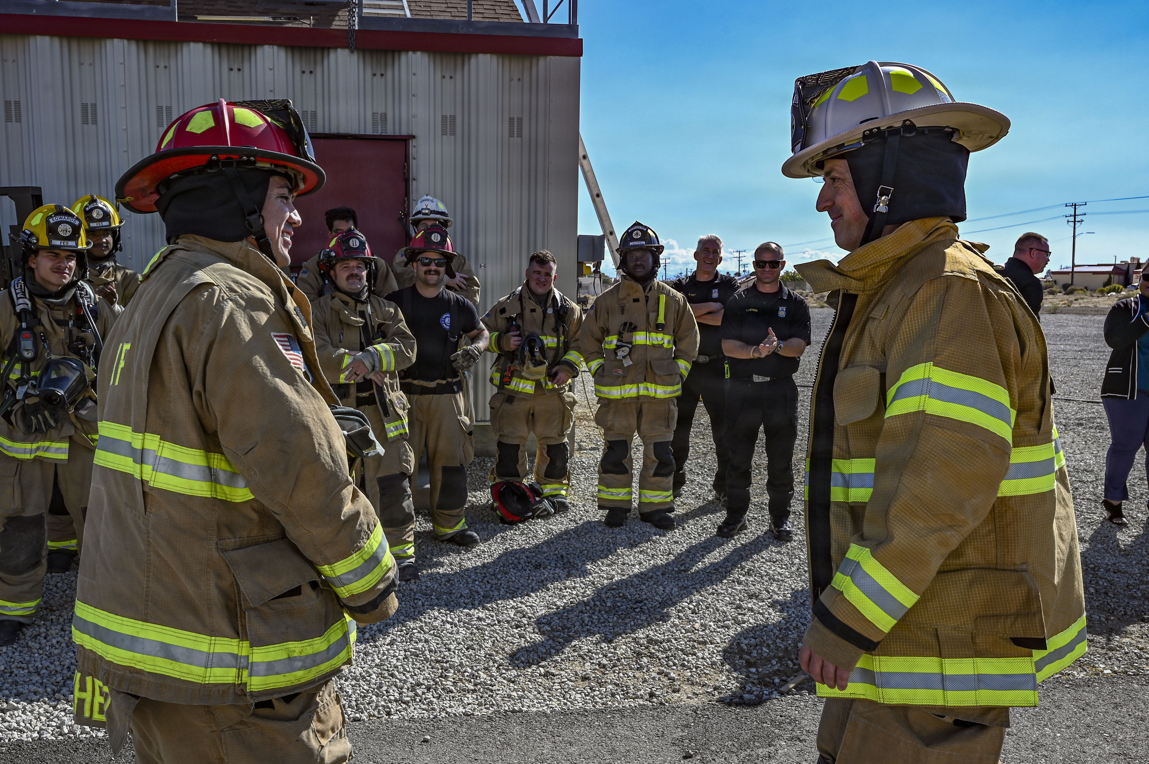 412th leadership and members of the 812th Civil Engineer Squadron conduct structural fire training at Edwards AFB Oct. 22. (Photo by Master Sgt. Tabatha Arellano, AFTC)