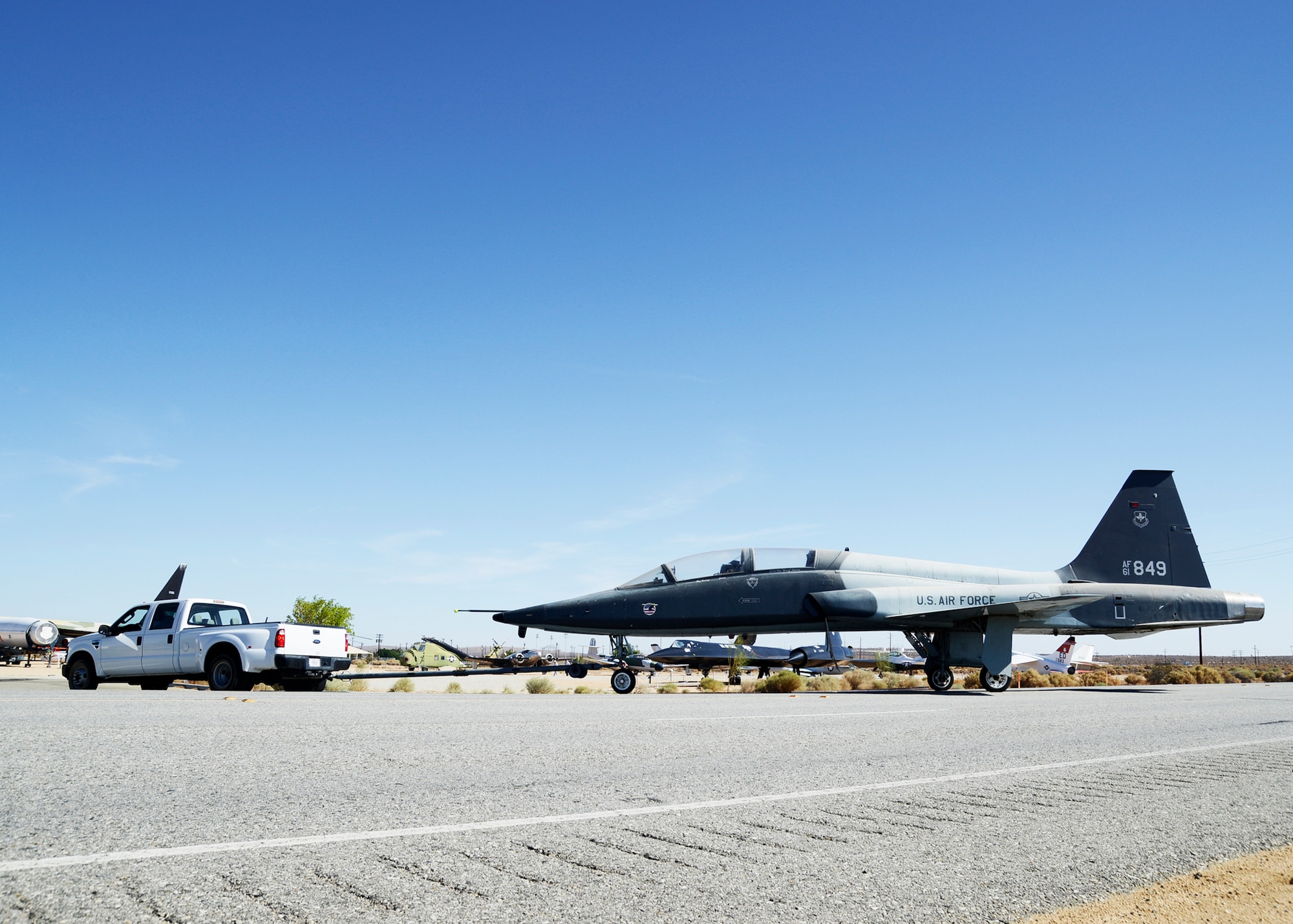 AFFT Museum moves three aircraft out of storage Published Aug. 12, 2013 By Rebecca Amber Staff writer EDWARDS AIR FORCE BASE, Calif. -- The Air Force Flight Test Museum at Edwards AFB, Calif., brought three aircraft, a T-38A, a single-seat F-16XL and an X-4 Bantam, out of storage Aug. 9. Traffic was stopped as the aircraft made their way down Rosamond Blvd. to the museum. It was a rare treat for the bi-weekly General Public Tour given by the 412th Test Wing Public Affairs Office, which had tourists visiting the museum at the time. "Coming on the tour we didn't expect to be able to see planes driving into the museum, so we feel very honored that we were here at the right time and the right place," said Jennifer Perot, tour attendee. "It was quite an experience." Her husband, Morris Perot added, "It's pretty cool to get a sense of the history just driving down the road." Prior to the move, the aircraft were stored at Hangar 1864, the museum's restoration hangar. According to George Welsh, AFFT Museum curator, "The T-38 was in great shape." He added that the aircraft had been adopted by a local Eagle Scout group which volunteers to maintain its appearance. William Simone, Flight Test Historical Foundation Board Member and Museum Committee Chairman said, "The T-38A, a late 1950 design, was the first supersonic trainer to enter service. Approximately 75,000 pilots, including virtually every Air Force pilot since 1961, have been trained in the T-38. After 50 years of service it is still training future pilots and used by the United States Air Force Test Pilot School here at Edwards." He added that the F-16XL, an experimental fighter, is a derivative of the F-16 that was used to explore the advanced cranked-arrow delta wing. Of the two that were built, the museum has the number one bird. After more than a decade of outdoor storage, the X-4 underwent a complete external restoration by a group of volunteers. "The X-4, purely an experimental aircraft, is a late 1940 design that explored the flight characteristics of tailless aircraft in the transonic speed range. This aircraft is unique in that only one pilot, Charles Tucker, flew it during its entire career," said Simone. The X-4 now sits in the museum repainted in its original color scheme of red and light grey stripes. Northrop Grumman originally added the red stripes to improve visibility to the very small aircraft. The three aircraft that were moved "represent nearly 70 years of aviation excellence," said Simone. Senior Airman Lucas Underwood, 412th Aircraft Maintenance Squadron, has been volunteering at the museum working on airframes since he moved to Edwards in 2011. He was on a base tour for first-term Airmen when the tour guide suggested volunteering at the museum. "Unfortunately the museum was closed," said Underwood. "But, we were told that if we ever wanted to do something interesting with our time here, instead of just going out to Los Angeles or Vegas, we could talk to the museum curator and do some volunteer work." Underwood recalled first seeing the museum's X-4, which now sits inside the museum, as being "pieces on trailers." He explained that it had been outside for years and was in desperate need of restoration. "I actually got to see the thing being built from the ground up," said Underwood. "Active duty, I work on the F-16, but now I can say that I've had some involvement with the SR-71, F-22, F-117 and the X-4," said Underwood. "There are only a handful of these kinds of aircraft that you can actually work with because of them being kind of out-dated and retired. I never would have had any involvement with the projects if it weren't for getting involved with the museum." Welsh said that moving the aircraft has freed up space in the restoration hangar allowing them to make plans to move additional aircraft from South Base that need restoration. "That's why we're here, to preserve [the aircraft] and use them to educate people as to what the aircraft did here at Edwards and what the significance was," said Welsh. He concluded that adding more aircraft to the museum's outdoor static display will allow people to see base history even after museum hours. The aircraft will be supplemented with outdoor graphics that tell their stories. Welsh mentioned the aircraft on display also act as a staging area for the new museum that is set to be constructed outside the West Gate on Rosamond Blvd. "[Moving the aircraft] consolidates our collection. We do have an amazing collection of aircraft and now, with the help of security forces, base civil engineering and airfield management, we can show it to the public," Welsh said.