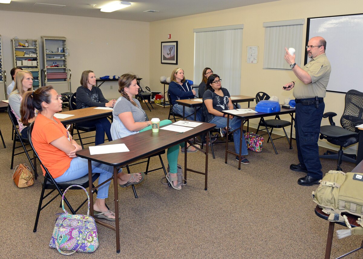 Stayin' Alive: Edwards spouses undergo CPR training Published April 13, 2017 By Kenji Thuloweit 412th Test Wing Public Affairs EDWARDS AIR FORCE BASE, Calif. -- As part of an effort to give spouses better insight to the Edwards mission and operations, the 412th Medical Operations Squadron held CPR and medical emergency classes during the week of April 3. Three separate classes were conducted at the 412th Medical Group Education and Training building to ensure any and all spouses were given the chance to attend. The attendees learned how to perform CPR on both children and adults along with short lessens on how to handle a person having a stroke, poison control and local wildlife information. During the CPR portion, the class learned how to perform chest compressions to the beat of the song “Stayin’ Alive” by the Bee Gees, which is recommended by the American Heart Association. The class is part of an initiative led by Pauline Schaefer, wife of Brig. Gen. Carl Schaefer, 412th Test Wing commander, to help spouses become more familiarized with base operations. Last month, 40 spouses attended a special training event where they learned how the base deals with emergencies at the Crisis Action Team building. The Edwards Officers Spouses Club hopes to arrange more events like these in the future. “We’re trying to foster more availability for spouses to get together and learn more about the base,” said Nikki Davis, current EOSC president. Davis added that these events are open to all spouses related to Edwards and if anyone has any ideas or recommendations for upcoming training events, they can visit the EOSC Facebook page.