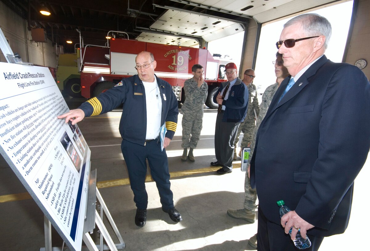 Chief Michael Hurles, 95th Air Base Wing fire department, briefs Paul Parker, Air Force Materiel Command Communications, Installations and Mission Support director, on requirements necessary for the proposed construction of a replacement fire station, located closer to the middle of Ramp 1. Mr. Parker visited the base Jan. 18 through Jan. 21 and toured the fire department, Rosburg Fitness Center, Civil Engineering office and Air Force Research Laboratory Detachment 7, among others. (Air Force photo by Rob Densmore)