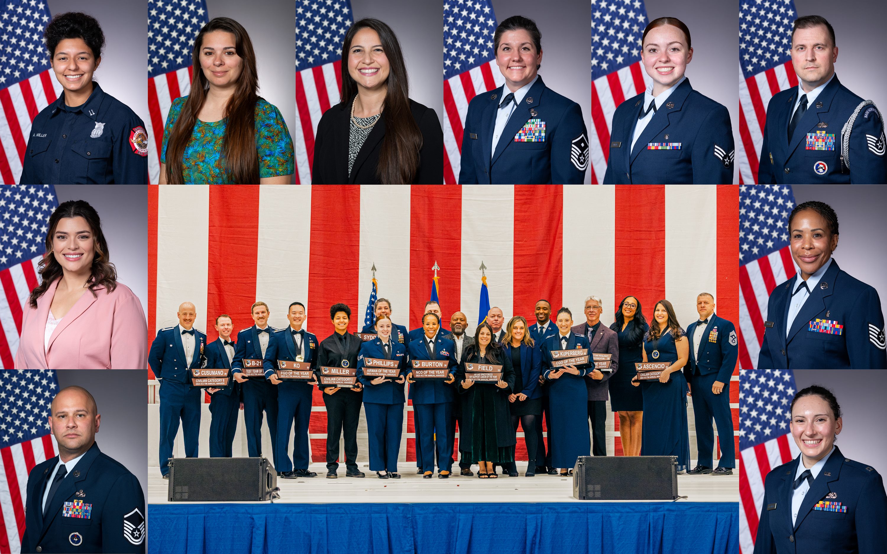 412th Test Wing honors star performers Published Feb. 25, 2026 By Laisa Leao 412th Test Wing Public Affairs Office EDWARDS AIR FORCE BASE, Calif. -- The 412th Test Wing recognized its top performers at its annual awards ceremony on Feb. 20. Test wing commander Col. Tom Tauer, and Chief Master Sgt. Joshua Skarloken, wing command chief, presented the awards. "This entire team, not just the award winners or nominees, should be proud of what we do," Tauer said. He noted a long list of accomplishments from the past year, including accelerating the $80-million B-21 program, testing two combat collaborative aircraft, securing F-35 nuclear-capable status and advancing the long-range standoff weapon. "This wing’s work on the B-2 over the last several decades is what enabled the largest strike of B-2s in Operation Midnight Hammer this year," Tauer said. "Truly impressive and it makes me really proud to be part of this wing." Portraits of the winners will be displayed at the entrance of test wing headquarters. "The things that we do here are the future of the Air Force," Skarloken said. The event's guest speaker, retired Chief Master Sgt. Roosevelt Jones, based his remarks on the theme "A Night of Stars." "These stars don’t shine alone. They shine because of alignment, because of the gravity that pulled you here to Edwards Air Force Base," Jones said. "Family is where standards are first learned, where accountability is molded long before it is enforced, where service becomes a value, not an obligation. Every Airman recognized tonight is supported by someone who made it possible." Chief Master Sgt. Joshua Skarloken, 412th Test Wing command chief, congratulates Senior Airman Julia Philips, 412th Medical Group, for winning the 2025 Airman of the Year award during the wing's annual awards ceremony on Feb. 20. (U.S. Air Force photo by Blaine Torres) Senior Airman Julia Philips, 412th Medical Group, won the Airman of the Year award. Philips supported Operation Inherent Resolve as a tactical casualty combat care instructor and security forces augmentee. She also filled non-commissioned officer roles across two medical fields. Clockwise from top left: Alysha Miller, 412th Civil Engineer Group, won the Civilian of the Year Category I award. Melissa Field, 412th Maintenance Group, won the 2025 Air and Space Forces Key Support Liaison of the Year award. Marcea Ascencio, 412th Operations Group, won the Civilian of the Year Category III award. Master Sgt. Julia Sydow, 412th Mission Support Group, won the First Seargent of the Year award. Senior Airman Julia Philips, 412th Medical Group, won the Airman of the Year award. Tech. Sgt. Derek Day, 412th Mission Support Group, won the Honor Guard Program Manager of the Year award. Tech. Sgt. Halima Burton, 412th Medical Group, won the Non-Commissioned Officer of the Year award. Capt. Jenna Kuperberg, 412th Maintenance Group, won the Company-Grade Officer of the Year award. Senior Master Sgt. Paul Couch II, 412th Maintenance Group, won the Senior Non-Commissioned Officer of the Year award. Bryn Cusumano, 412th Maintenance Group, won the Civilian of the Year Category II award. (Portraits by Chloe Bonaccorsi, photo by Blaine Torres) Tech. Sgt. Halima Burton, 412th Medical Group, won the Non-Commissioned Officer of the Year award. Burton led her team through 30 process improvements and staffing shortages, saving 720 man-hours. As Air Force Sergeants Association president, she led 552 members and hosted numerous community and leadership events. Senior Master Sgt. Paul Couch II, 412th Maintenance Group, won the Senior Non-Commissioned Officer of the Year award. Couch II authored the group’s manning support plan during the longest government shutdown in history. He procured $264,000 in parts to advance 11 national defense programs. Capt. Jenna Kuperberg, 412th Maintenance Group, won the Company-Grade Officer of the Year award. Kuperberg led 362 workers to sustain 17 F-35 aircraft, achieving 112 joint program office milestones and 809 developmental test hours. Maj. Jun Ko, 412th Medical Group, won the Field-Grade Officer of the Year award. Ko rectified 20 deficiencies for the group’s accreditation inspection, the best record in nine years. He established a wing resilience course and expanded in-house surgical care as the top-producing dentist. Maj. Justin Marsh, 412th Operations Group, won the IMA Field-Grade Officer of the Year award. Marsh led strategic planning to streamline safety for a $675 million, 27-aircraft test fleet. He secured over 1,000 days of reserve pilot support to fill a 26 percent manning shortfall. Tech. Sgt. Derek Day, 412th Mission Support Group, won the Honor Guard Program Manager of the Year award. Day managed a training plan for 65 ceremonial guardsmen, enabling 2,500 military funerals. He also dispatched 64 color guards for professional sports, memorials and parades. Master Sgt. Julia Sydow, 412th Mission Support Group, won the First Seargent of the Year award. Sydow led 14 additional-duty first sergeants, organized volunteers to keep the base gym open during the government shutdown and revamped the base food pantry. Alysha Miller, 412th Civil Engineer Group, won the Civilian of the Year Category I award. Miller directed crews through multiple vehicle accidents, safeguarded lives during medical emergencies, and certified 40 members in CPR. Bryn Cusumano, 412th Maintenance Group, won the Civilian of the Year Category II award. Cusumano overhauled 111 programs and managed an audit of 116 candidates, increasing capability by 25 percent. Her work was pivotal in securing certifications for 85 members, enabling the delivery of the second B-21 aircraft. Marcea Ascencio, 412th Operations Group, won the Civilian of the Year Category III award. Ascencio served as test conductor for the historic YIFQ-44A first flight, achieved in a record 16 months. She also spearheaded YFQ-42A flight tests, enhancing U.S. air superiority. Melissa Field, 412th Maintena