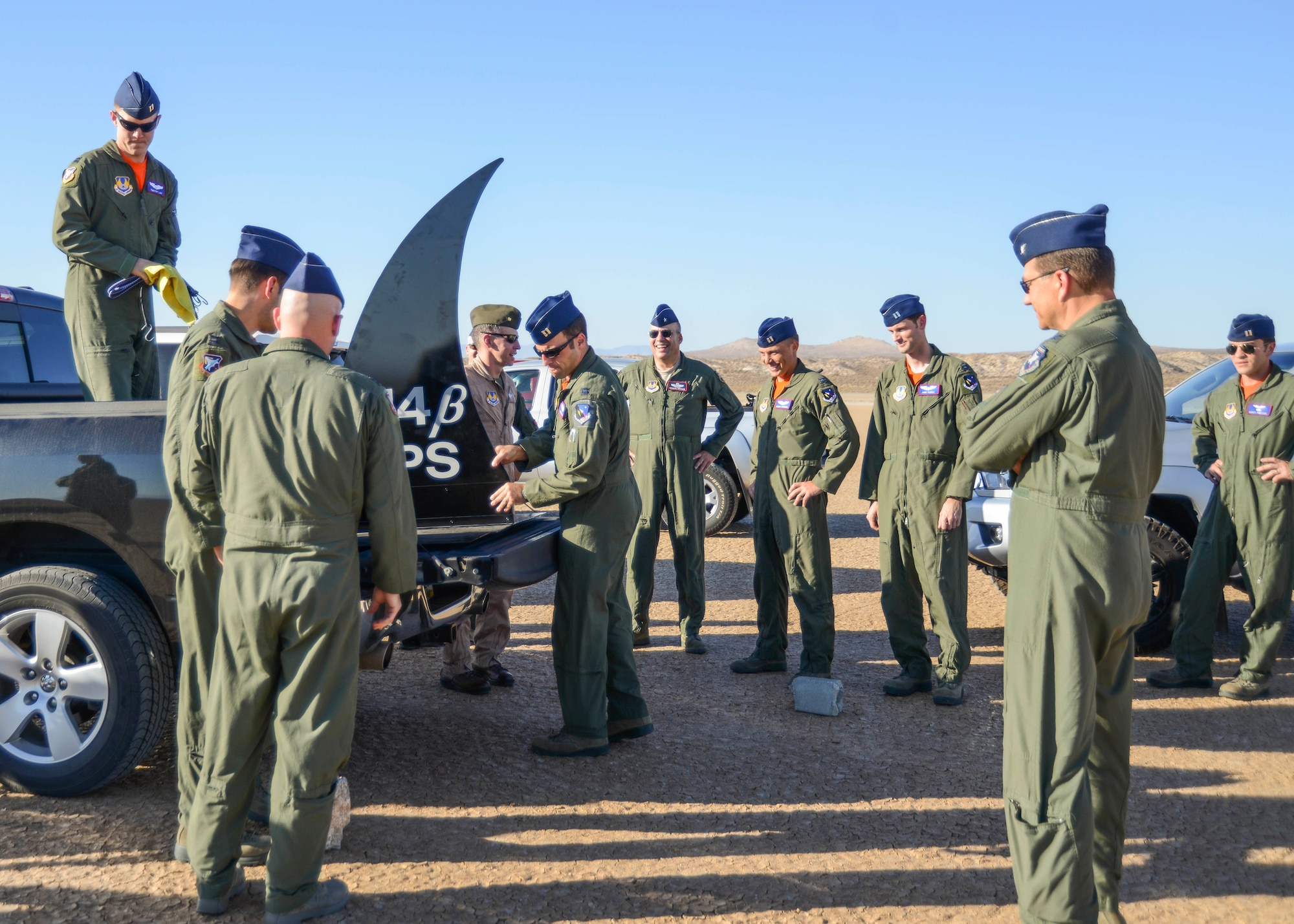 Lakebed creature re-surfaces in time for Halloween Published Oct. 28, 2014 By Rebecca Amber Staff writer EDWARDS AIR FORCE BASE, Calif. -- Many at Edwards can remember a time when the sunny skies of the High Desert would turn dark with rain. The Rosamond Dry Lakebed would fill with water, and legend has it, that the waters have been inhabited by powerful sea creatures. Some have reported shark sightings; others have claimed to witness the Loch Ness Monster. The tales may seem far-fetched, but the Desert Wings has confirmed, that one lakebed-dweller has survived the drought and made its home outside of the west gate. While origins of the shark and other sea monsters are shrouded in mystery, witnesses have reported sightings as early as the 1970s after a heavy rain. The lakebed shark eventually disappeared and later reappeared until the 1990s, where it was thought to be gone for good. In 2013, the metal fin, which created the illusion of a shark, re-surfaced after being discovered by U.S. Air Force Test Pilot School students. Prior to its discovery, there were rumors of the fin floating through the base housing area and another, previous fin, residing in Rosamond. After locating the fin, the school brought it to the house of Brig. Gen. Michael Brewer, 412th Test Wing commander, where it stayed for a while. TPS Class 14B took the liberty of having the fin fixed-up with the help of the 412th Maintenance Group. The fin now has a new, black paint job and is stenciled with the Class 14B designation on the side. "All those people who had been here during that timeframe [when the shark inhabited the lakebed] had all seen the fin and just had that lingering question, 'where'd the shark fin go?'" said Lt. Col. Scott "Shark" McLaren, USAF Test Pilot School deputy commandant. Brewer, along with Class 14B, returned the fin to its former home on Rosamond Dry Lakebed Oct. 24. "From before 1995 when I was first stationed at Edwards there had been a shark fin on the lakebed; before that we had the Loch Ness Monster, which was a head and a hump and a tail," said Brewer. "Coming into Edwards, when you realized you had 14 miles to drive to the gate, one of the first things you saw was the shark fin in the middle of the lakebed and that was just part of the tradition of coming to Edwards." Over the years, different organizations on base have placed their own variation of the infamous fin out on the lakebed. Whether they have spotted the shark fin or the Loch Ness Monster, the creatures of the lakebed are a cherished memory for many. Thanks to TPS Class 14B, the shark can continue to create memories for many years to come. "We have a lot of things going on, there's a lot of change and sometimes you can very easily get wrapped into, 'we have a budget challenge' or 'we have a lot of work in front of us' - all true. That's why it's especially important to take the opportunity to enjoy things," said Brewer. "This is just one of a thousand things we do all the time to make our work fun and make Edwards a fun place to live as well." Although the shark won't bite (because it's not real), as a reminder, unauthorized access to the lakebeds is prohibited. - The Air Force Test Center History Office contributed to this article - Editor's note: The Desert Wings staff spoke with several people in the process of writing this article, all had varying accounts and stories about the origins of the lakebed shark(s).