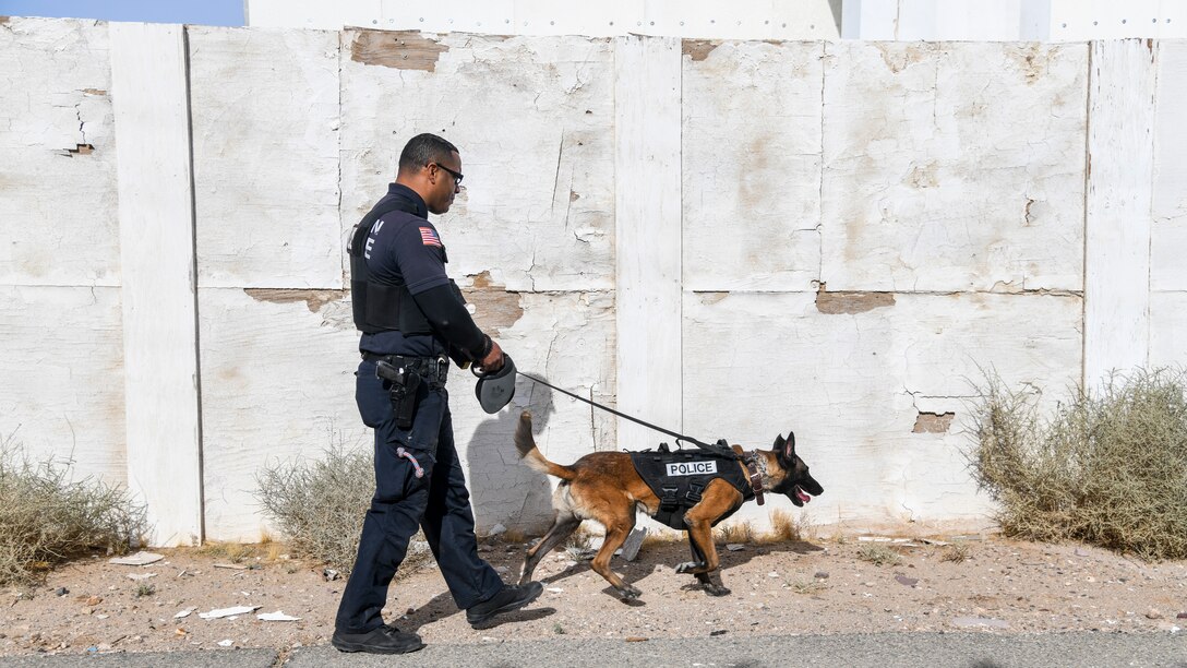 Sgt. Damian Williams, Fort Irwin Police Department, and his partner Cash look for planted narcotics during a joint Military Working Dog training session at the National Training Center on Fort Irwin, California, Dec. 11. (Air Force photo by Giancarlo Casem)