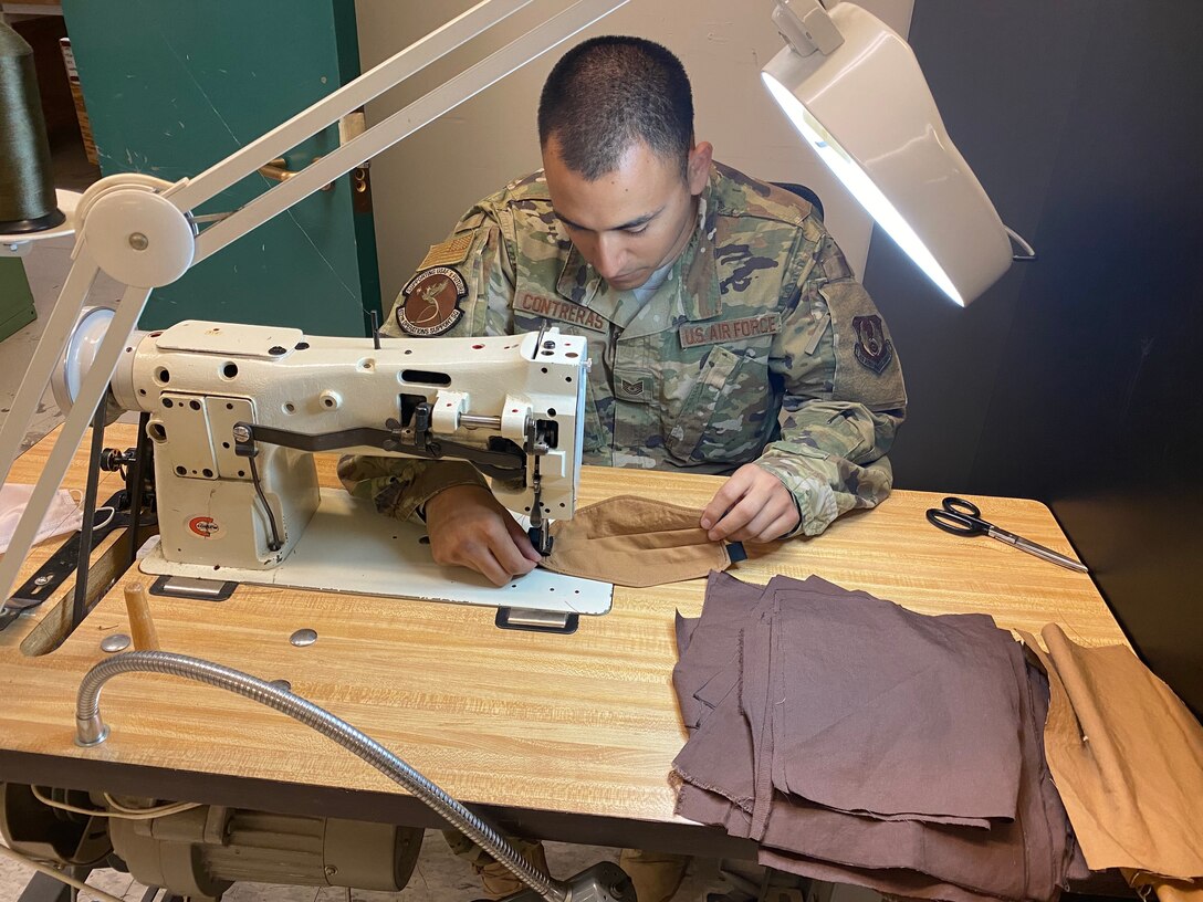 Tech. Sgt. Roman Contreras, quality assurance, air crew flight equipment, 412th Operations Support Squadron, 412th Operations Group, 412th Test Wing, fabricates a cloth mask using available equipment in the Air Crew Flight Equipment section at Edwards Air Force Base, April 7. Although cloth masks don’t offer full protection from COVID-19, the CDC advises that a simple cloth covering can slow the spread of the virus and help people who may have the virus and not know it from spreading it to others. (Courtesy photo)
