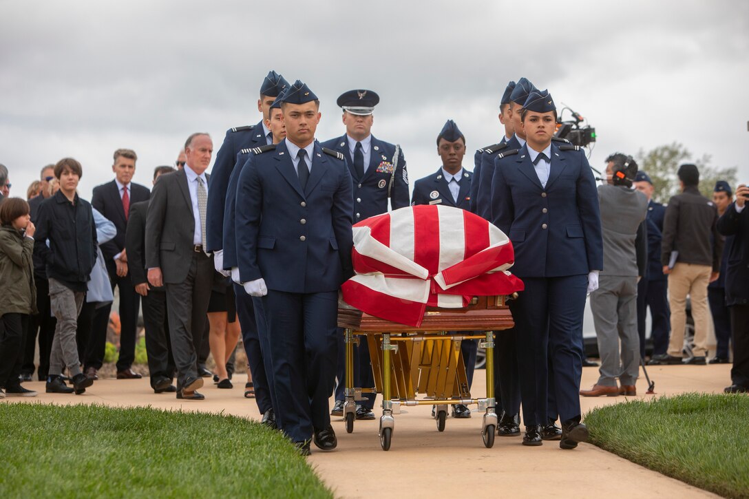 The March Air Force Base Honor Guard lays retired Air Force Brig. Gen. Robert Cardenas to rest at the Miramar National Cemetery, San Diego, California, March 31, 2022. Cardenas was born March 10, 1920, and passed away March 10, 2022. (U.S. Marine Corps photo by Cpl Raynaldo Ramos)