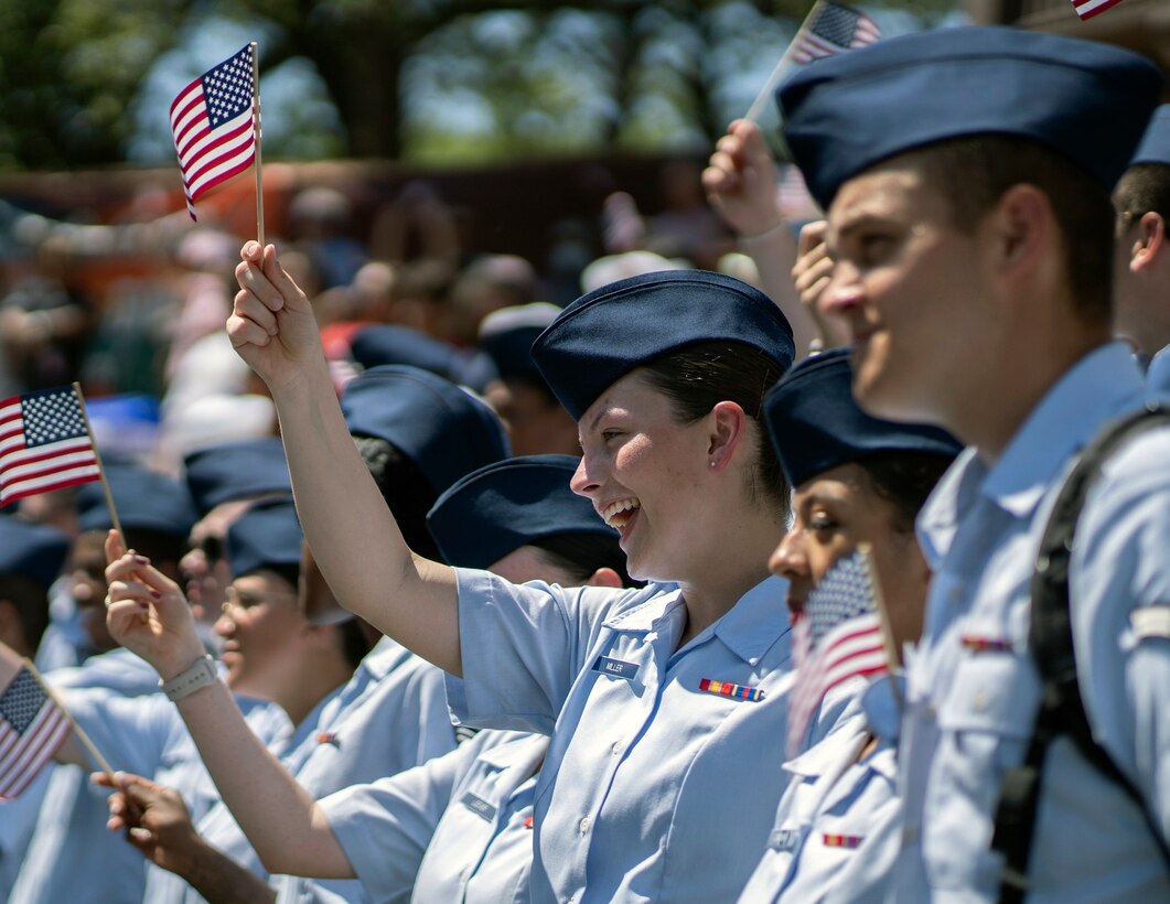 Technical training students assigned to the 37th Training Group cheer on senior leaders from Air Education and Training Command and Joint Base San Antonio during the Armed Forces River Parade in San Antonio, July 2, 2022. The annual parade route on the San Antonio River Walk honors and supports the men and women from all branches of the United States armed forces and features patriotically decorated floats. (U.S. Air Force photo by Nicholas J. De La Pena)