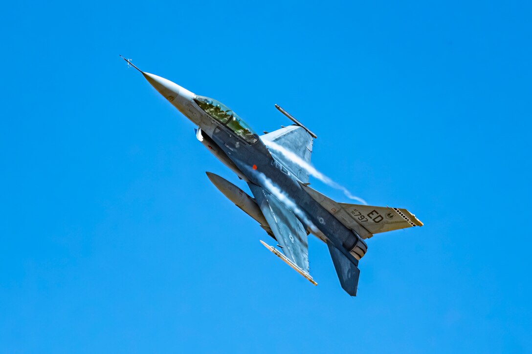 An F-16D Fighting Falcon flies over the Precision Impact Range Area on Edwards Air Force Base, California, May 10. As part of the U.S. Air Force Test Pilot School Space Test Course Class 23-1 capstone project, the F-16 dropped munitions onto the PIRA and used satellite imagery to conduct battle damage assessment. (Air Force photo by Giancarlo Casem)